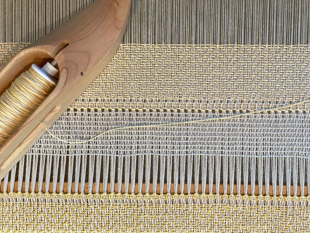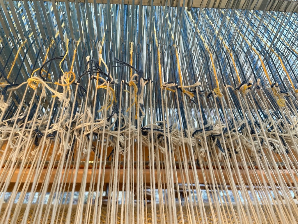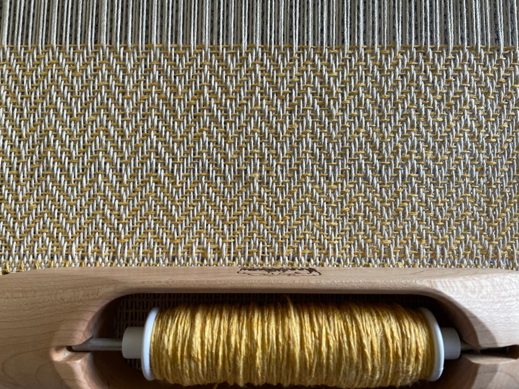 After the blue towel was the right length, I started a new one with a different easier treadling pattern using Gist Duet warp yarn in yellow.