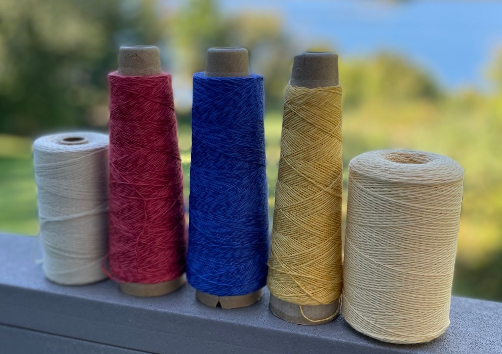 I had measured out enough warp yarn for three towels. The photo below shows all the yarns I used for the project, including the warp yarn off white 8/4 cotton on the left, three colors of Gist Duet cotton/linen blend weft yarn for three different towels, and yellow 8/4 cotton on the right used for a forth smaller towel.