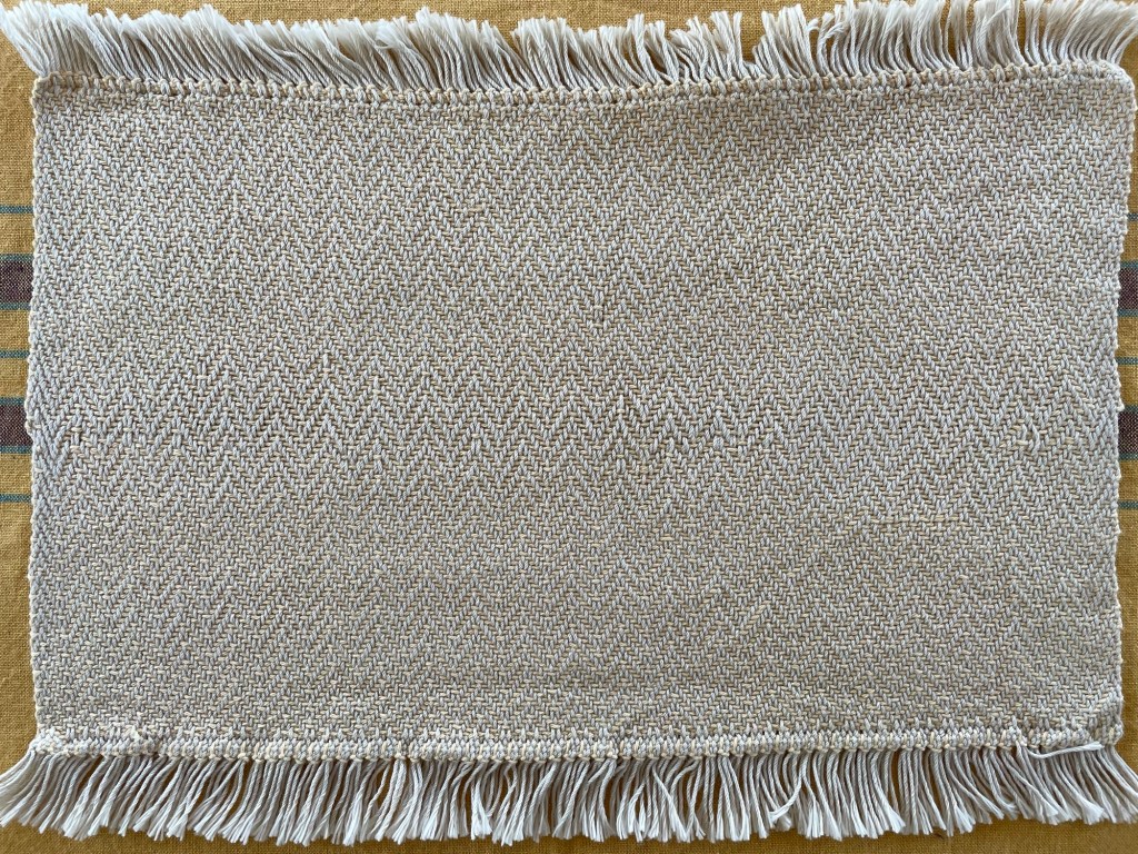 When I finished weaving the red, blue and yellow towels, there was still some warp yarn left. It was not enough for a whole towel, but it was enough to do some sample weaving using a different weft yarn for comparison. I used the same treadling pattern as the yellow towel, but with weft yarn of yellow 8/4 cotton instead of the Gist Duet cotton/linen blend. The 8/4 cotton is a bit thicker, so I wanted to see how those two weft yarns compared with the same warp yarn and ends per inch.