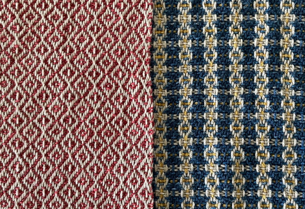 The first towel has all off white for the warp, and all red Gist Duet cotton/linen blend for the weft, shown next to the towel with the exact same pattern but with stripes and a different combination of yarns from last fall. It is hard to believe they are the same pattern.