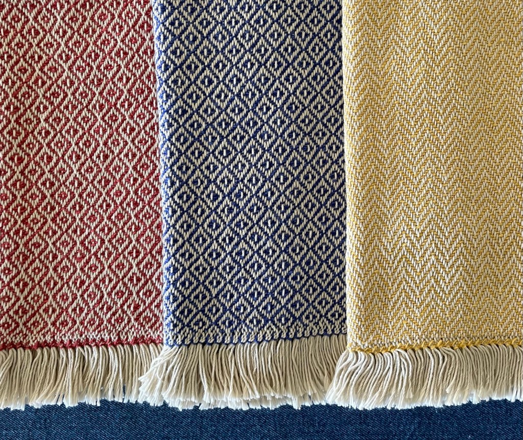 The last sample towel was woven with the same treadling pattern as the yellow zig zag towel, but using yellow 8/4 cotton for the weft yarn, instead of the Gist Duet cotton/linen blend. The 8/4 cotton is a bit thicker.