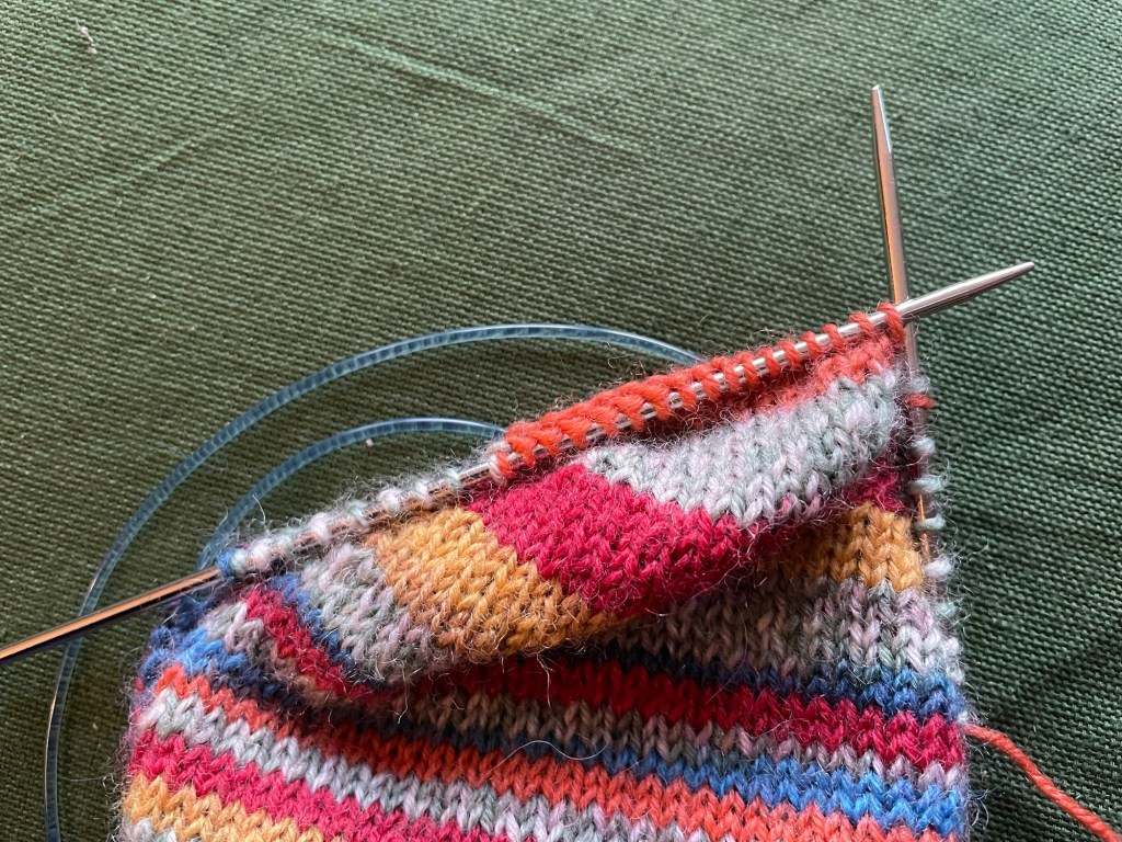 When I got close to the place to start the heel, I added some stitches on each side to make the short row heel fit better, using the Custom Toe Up Socks course from the School of Sweet Georgia as a guide.