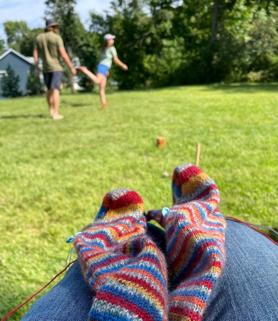 I continued working on these socks over the summer when the young adult kids were playing Kubb at the lake. They are too old to be kids. Are they still “young” adults when they are in their late 20’s?. What do we call them? What do we call us? Anyway, I had never heard of Kubb until we went to a birthday party for one of Wayne’s friends at a brew pub. They had an area for outdoor games, including Kubb. One of the cousins brought this game to the lake. They all had a blast throwing blocks of wood, trying to knock over other blocks of wood. That is about all I can tell you about this Swedish game. You can read more here if you are interested.