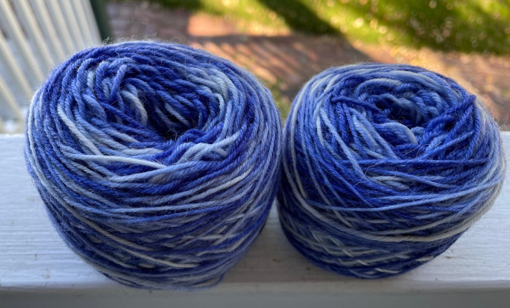 I made two center pull balls of equal weight, one for each sock. The cake that looks bigger is actually a few ounces less than the other cake, because it is wound looser.