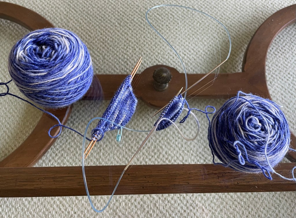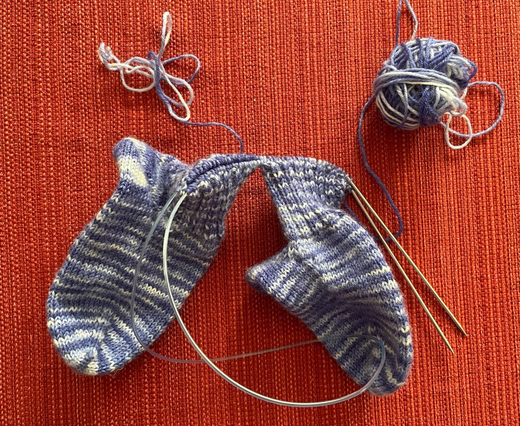 If I knitted Kelsey’s sock with 60 stitches, the heel and cuff would be too tight. ARGGG, I concluded there should be 64 stitches around. That meant unknitting a couple of rows, putting one sock back on the double pointed needles and doing another increase row on each sock.