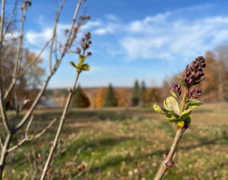 We also had unseasonably warm weather late in the fall, which caused some lilac bushes to bloom in Minnesota. Our big overgrown lilac bush did not bloom again, but a small bush had new growth. This seems very unhealthy and not what is supposed to happen. I heard that if a bush blooms in the fall, it will not bloom in the spring. We will see.