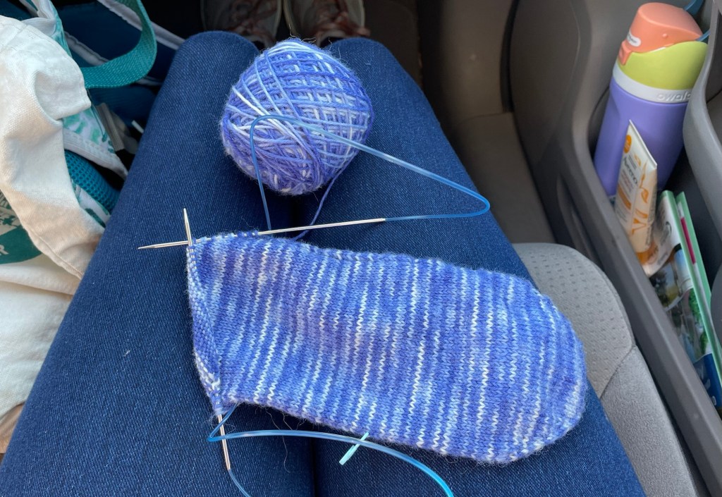 I worked on the heel in the car using my favorite short row method, Fish Lips Kiss Heel. I can almost do this without looking at the pattern. The standard way to do the heel is using exactly half of the stitches. Since you cannot add stitches on the sock machine to make the short row heel fit better, the way to make the heel “deeper” is to use more than half of the stitches. Since I was trying to mimic a sock made on the sock machine, I made the heels using two more stitches on each side of the heel.