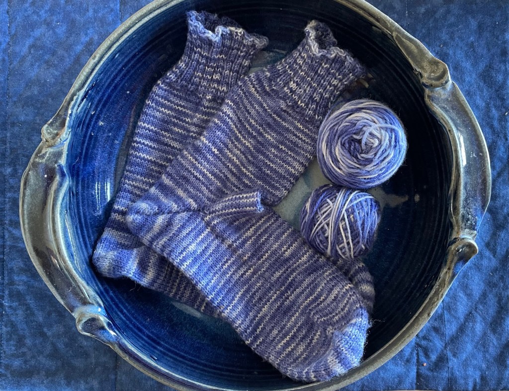 I had some other hand knit socks that needed to be washed. I put all the socks in a tub of warm water with a bit of wool soap, carefully rinsed them with clean water, squeezed out extra water, rolled them in a towel to remove more water, and then spread them out to dry. Most of these socks are made with superwash yarn that has been processed so it won’t shrink in the washing machine. The process used to get it this way is not good for the environment, but that is a different topic. I have always been nervous about putting handmade socks in the washing machine, not wanting to take a chance on ruining them. Later I tried it with a couple of pairs and found it worked fine, noting that I did not put them in the dryer.