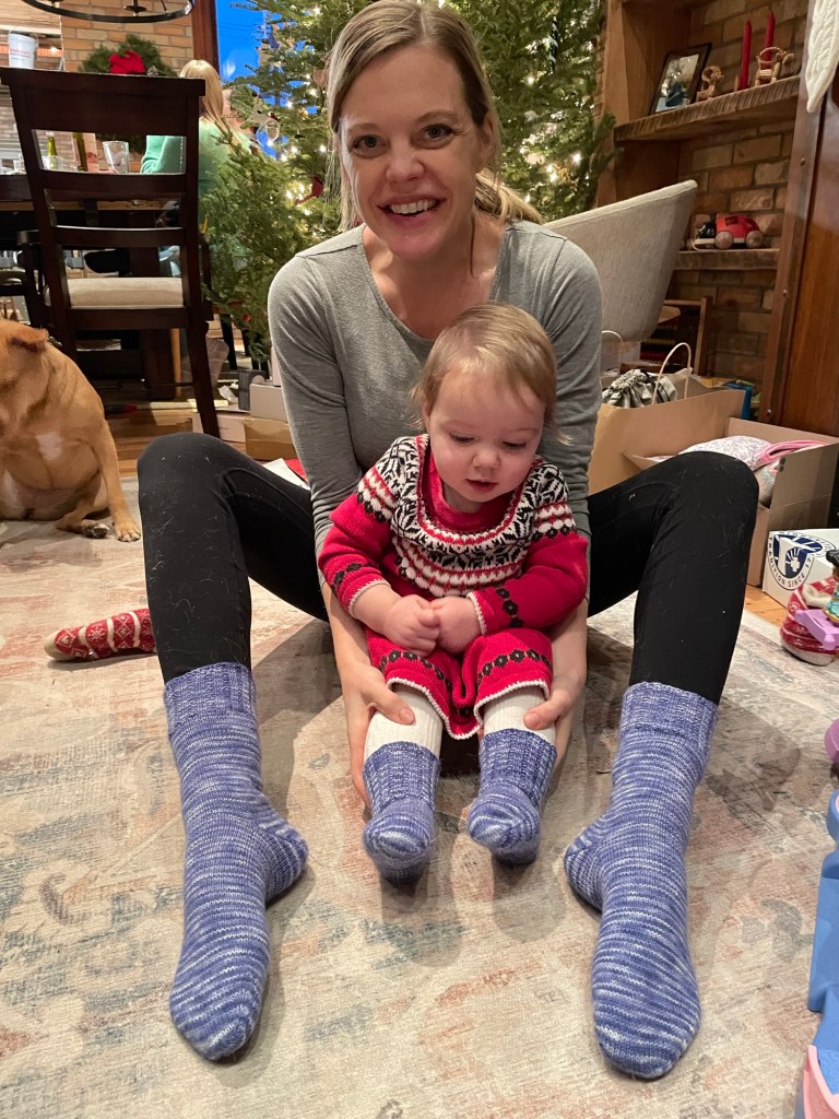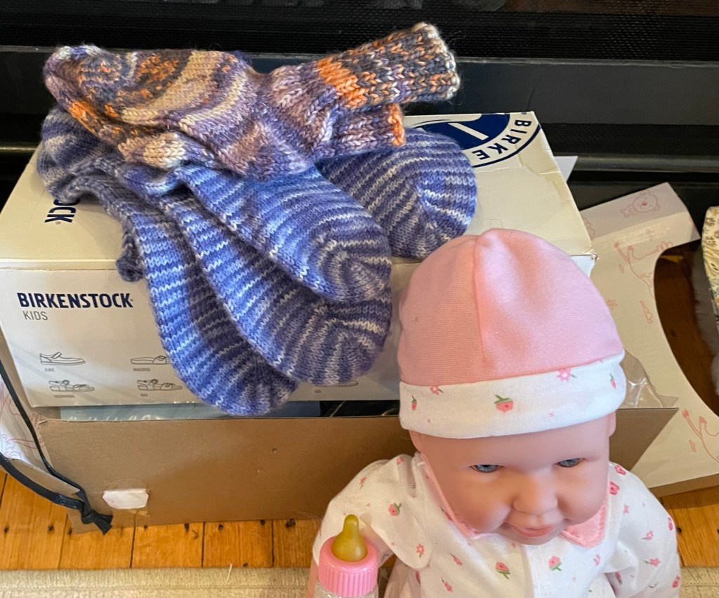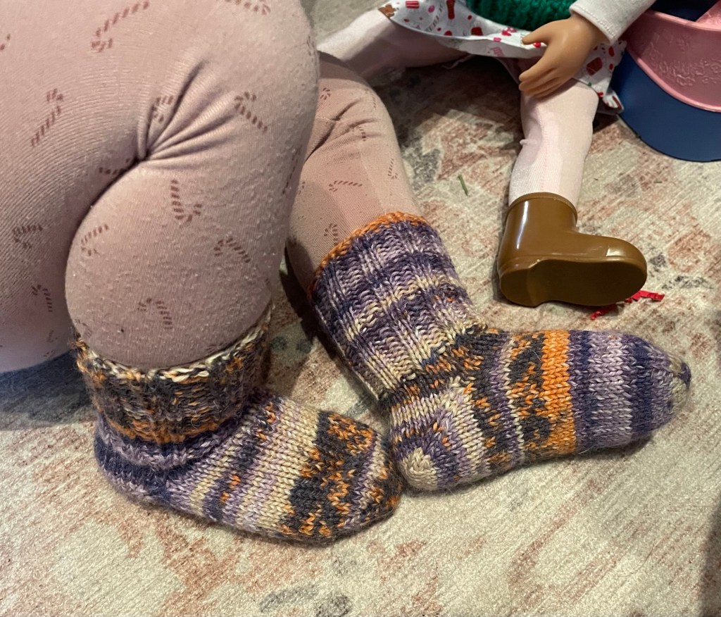 I gave the pairs of matching socks to Kelsey and Blair for Christmas, along with another pair of toddler socks I had knit years ago. Blair was not excited about the socks (no surprise), but she did like the baby doll she got from Santa. She also got an American Girl size doll from her great great aunt who has never met her, with a whole box of clothes and accessories hand made by a friend of hers.