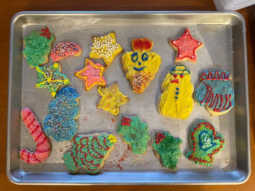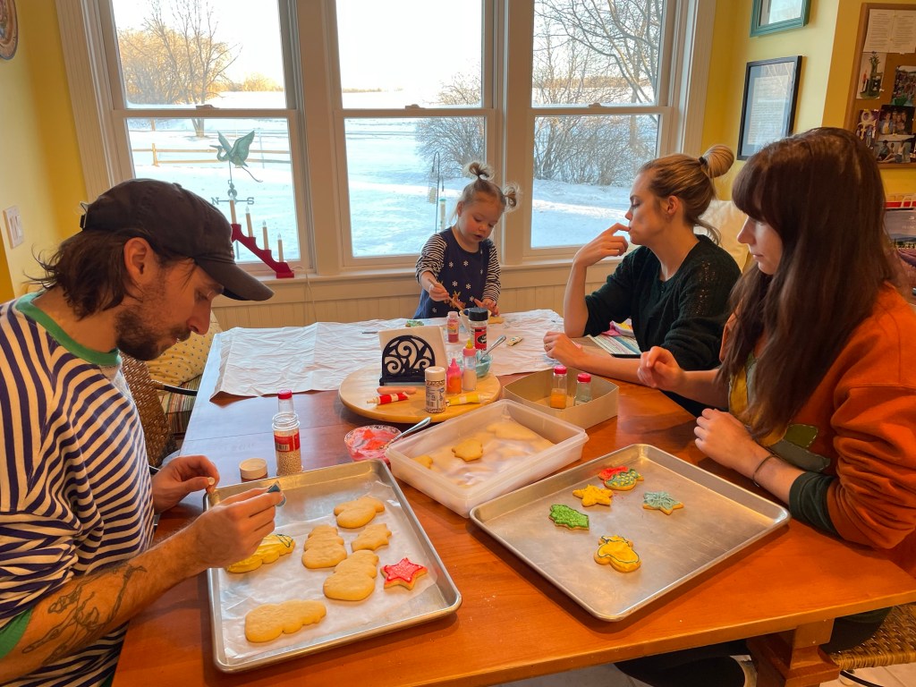 The rest of the guests arrived early in the afternoon on Saturday, including our daughter Britta, my sister and her husband Betsy and Ron, our niece and her husband Em and Cooper, and our nephew Dan. There were also three dog visitors. After everyone was settled in, the first group activity of the weekend was frosting Christmas cookies I had baked earlier.