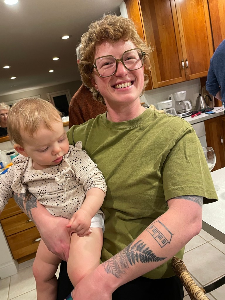 The rest of the photos are grouped by subject, and are not necessarily in chronological order. Nora got passed around a lot, which was a nice break for James and Kelsey. Nora admired Em’s tattoo of the family cabin on her arm.