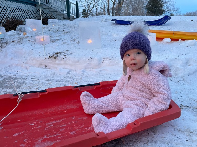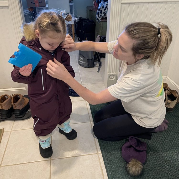 James took Blair outside and down the backyard towards the lake, after Kelsey got her bundled up in her snowsuit. In the photo below she is holding a cooler pack that she sometimes requests for an “owie”, whether she actually has one or not.