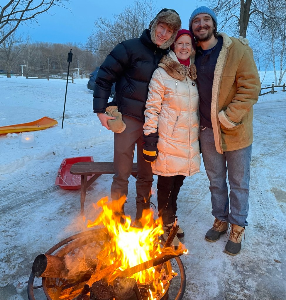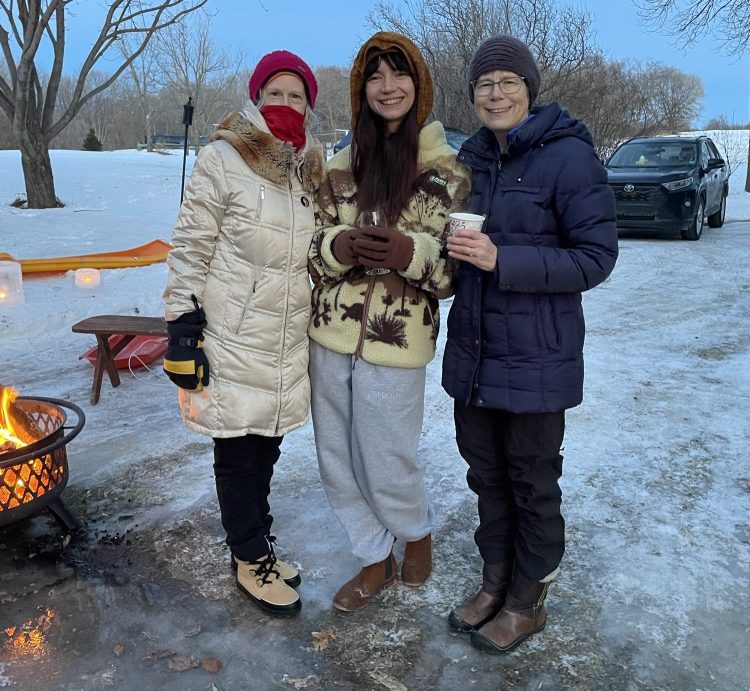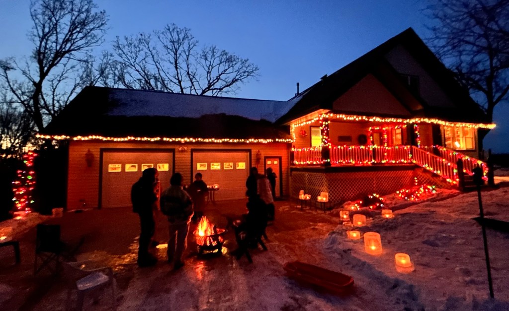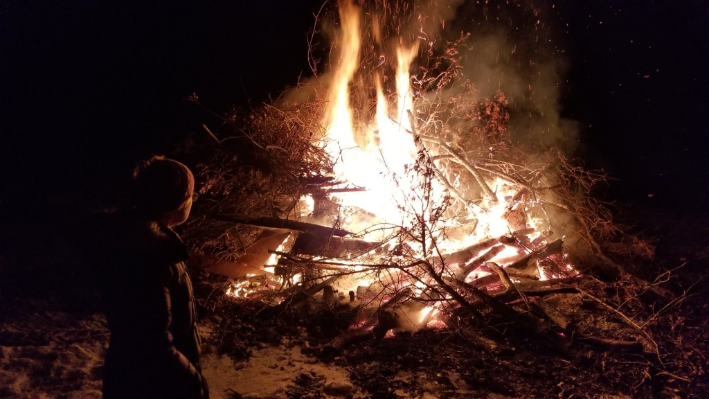 In the summer of 2020 we had a tornado come by our side of the lake, where we live in West Central Minnesota. It was pretty traumatic. I wrote a blog post about it that you can read here. A lot of trees came down at our family cabin, all along the east side of the lake, and in our yard. After all the cleanup there was a massive pile of logs and brush at the cabin property. That December our son and daughter-in-law were here for a weekend visit, which happened to coincide with the Winter Solstice. We were inspired to have a celebration that included burning the giant brush pile. It was the biggest bon fire of our lives.
