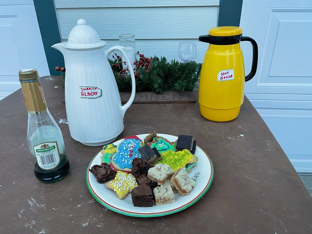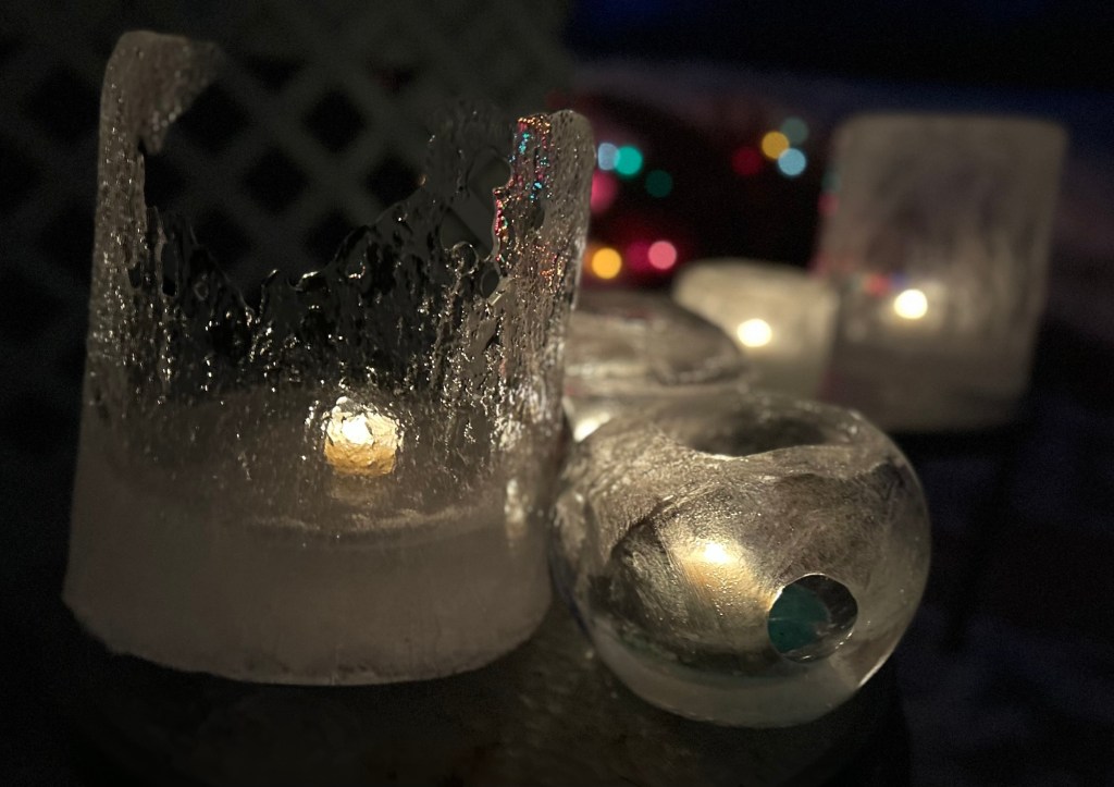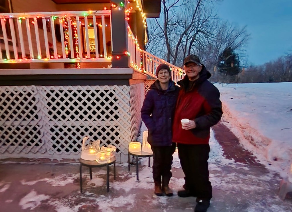On Sunday afternoon Wayne got set up for the Solstice celebration in the driveway. He brought a table outside for cookies and drinks, got a fire going in the metal fire pit, and lit ice lanterns. The extreme cold temperatures we had the previous week were not good for being outside, but were excellent for ice lantern production.