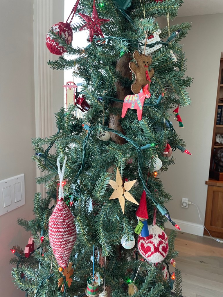Usually we do not have any company over the holidays, so we do not get out many Christmas decorations. We have a skinny tree that belonged to my parents. I have changed out many of the decorations to include some of my own favorites, including hand knit Christmas balls. At the end of the season this tree gets carried, as is, down to the furnace room in the basement, where it sits until the following season when we carry it back upstairs.