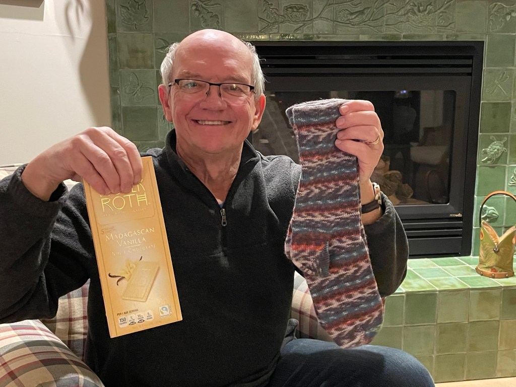 The next morning we opened a few Christmas gifts early. It did not make sense to bring gifts that Wayne and I had for each other down to the Twin Cities for the actual holiday. And we decided to have Blair and Nora open their gifts at our house, rather than on Christmas Day when there would be many more from other people at their house. Wayne got a pair of socks that I cranked on my circular sock machine, using the Schachenmayr Arne and Carlos self striping yarn he picked out for himself last Christmas, and some of his favorite white chocolate. I ordered some expensive yarn online for a sweater that I gave him to wrap without looking at it.