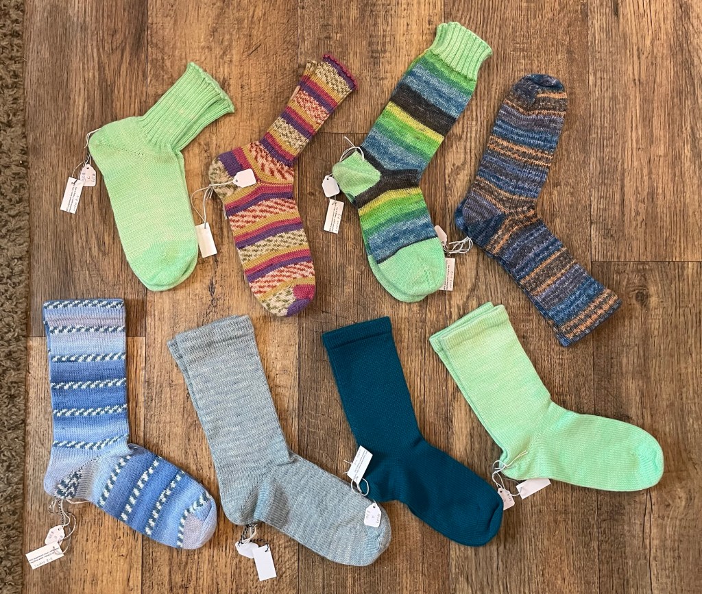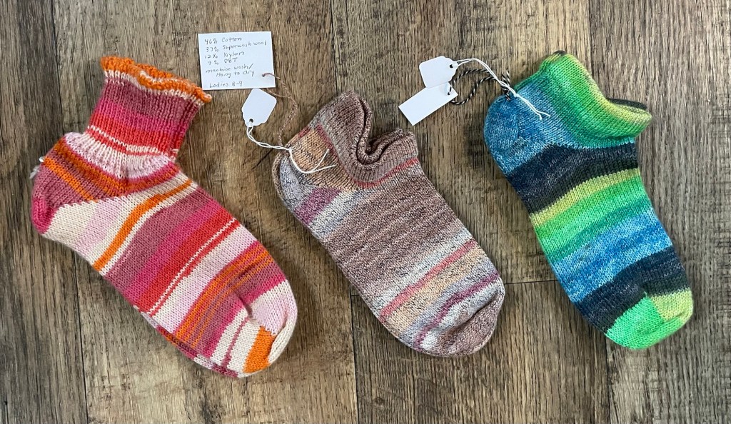 I did not want to crank out dozens of socks in every size and style and yarn option. I did make a limited number of new pairs, and then put up a sign offering to knit custom socks in the specific size, style, and yarn requested.