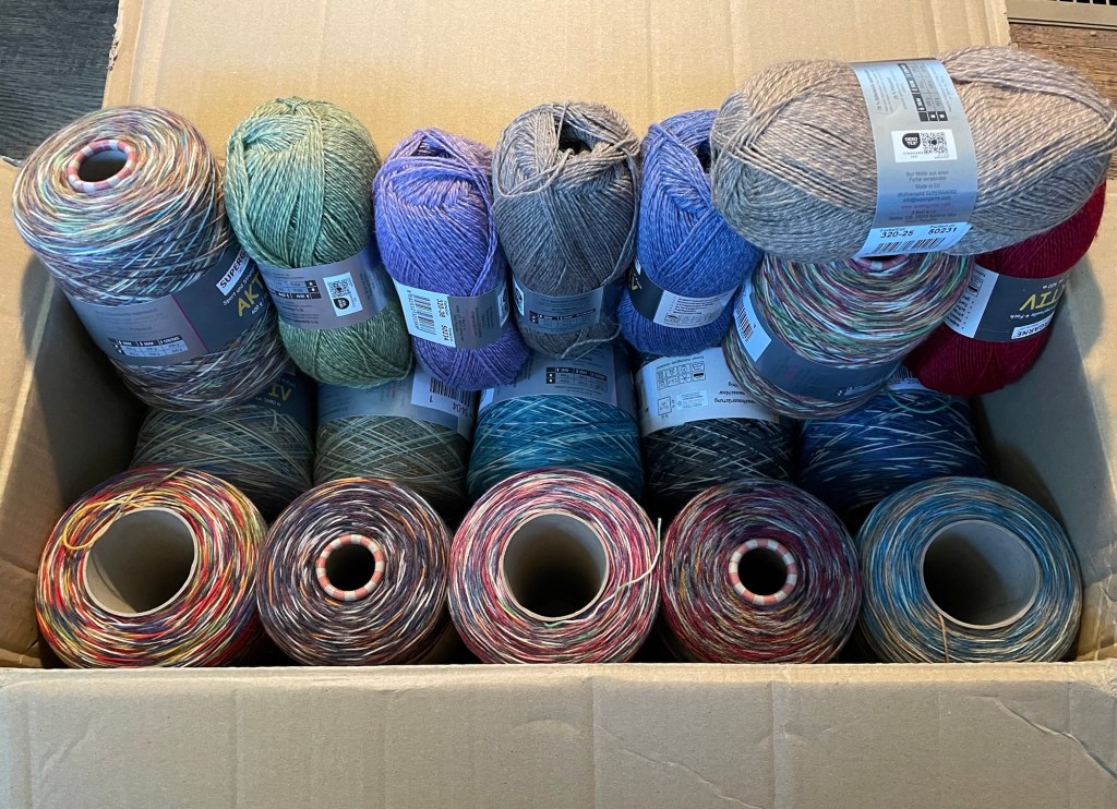 I had a limited supply of sock yarn to make more socks, so I ordered some Cascade yarn and some Aktiv yarn. Aktiv yarn is popular with crankers who sell many socks because it is good quality, reasonably priced, and comes on big cones. Even with the shipping cost, it came out cheaper on a per sock basis ordering directly from the company in Germany. It also arrived faster than the Cascade yarn. Following is a photo of the Aktiv yarn I bought in a variety of fun but not too wild colorways. I will be set for sock yarn for a long time (although that has never stopped me from buying more yarn haha).