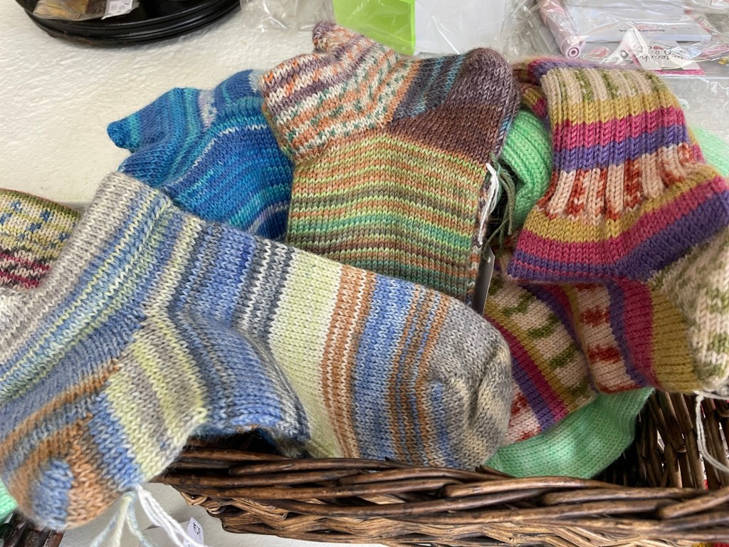 Over the last year I had collected a big bag of socks and accessories I cranked out on my circular sock machine. They were for practice, rather than for anyone in particular. I decided to try selling them at the gift shop at the resort. The items were already made, so minimal effort was involved. There is no sales commission, so there was nothing to loose. I was not sure if wool socks would be in demand in Arizona, however they are perfect for hiking which is a popular activity. Following are photos of some of the socks ready to go on sale at the gift shop.
