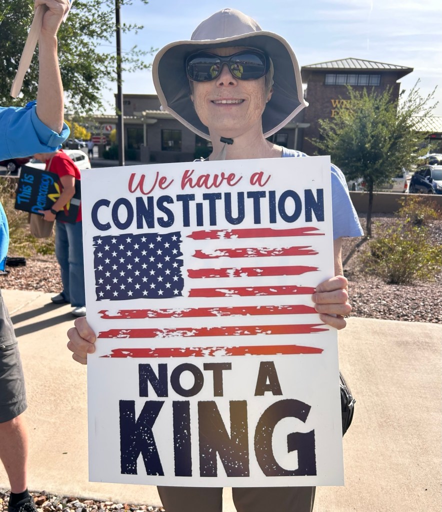 I participated in my first ever protest at a No Kings event on March 28. The flagship march and protest were held in my home state of Minnesota, but there were protests all over the country on the same day. We attended an event near Florence with our friends there. There were about 200 people participating, which seemed like a good turnout considering we were in the middle of nowhere. Participants held up signs along a busy road. Many people honked and gave us a thumbs up or waved their support as they drove by. Other people gave us a thumbs down or middle finger up, but it was all peaceful.