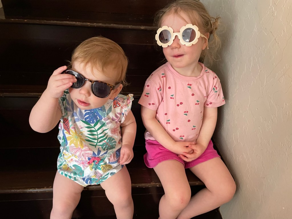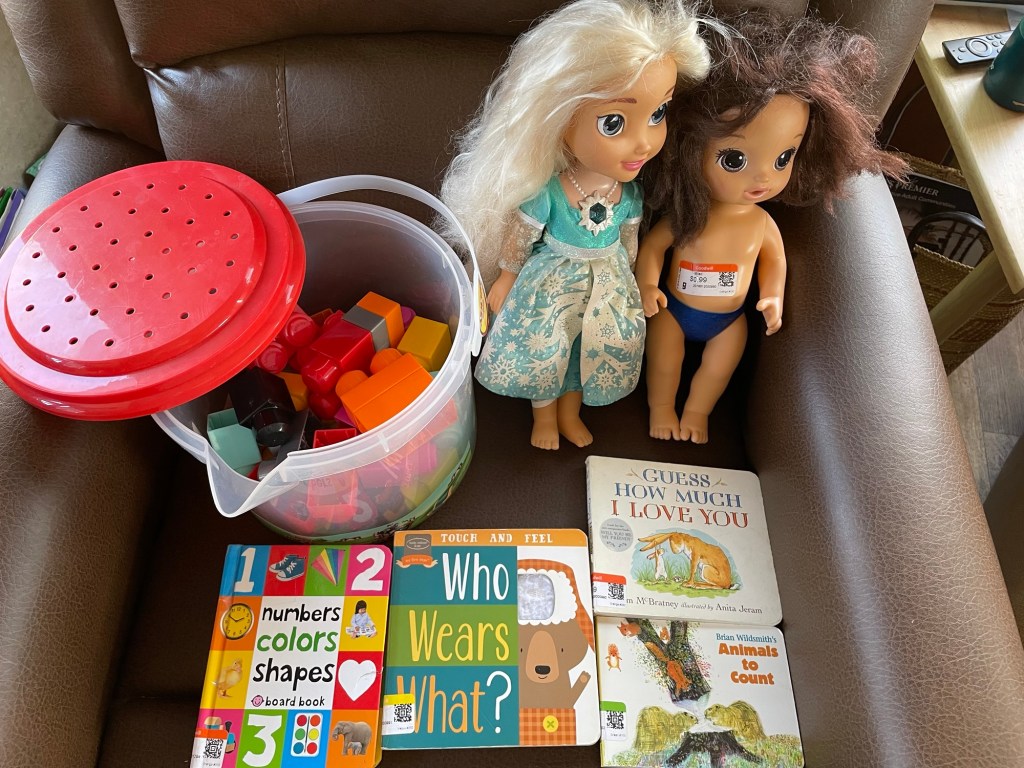 I went to Goodwill and spent a total of $10 on two dolls, four board books, and a bucket of Duplo to make sure the two granddaughters would have something to play with.