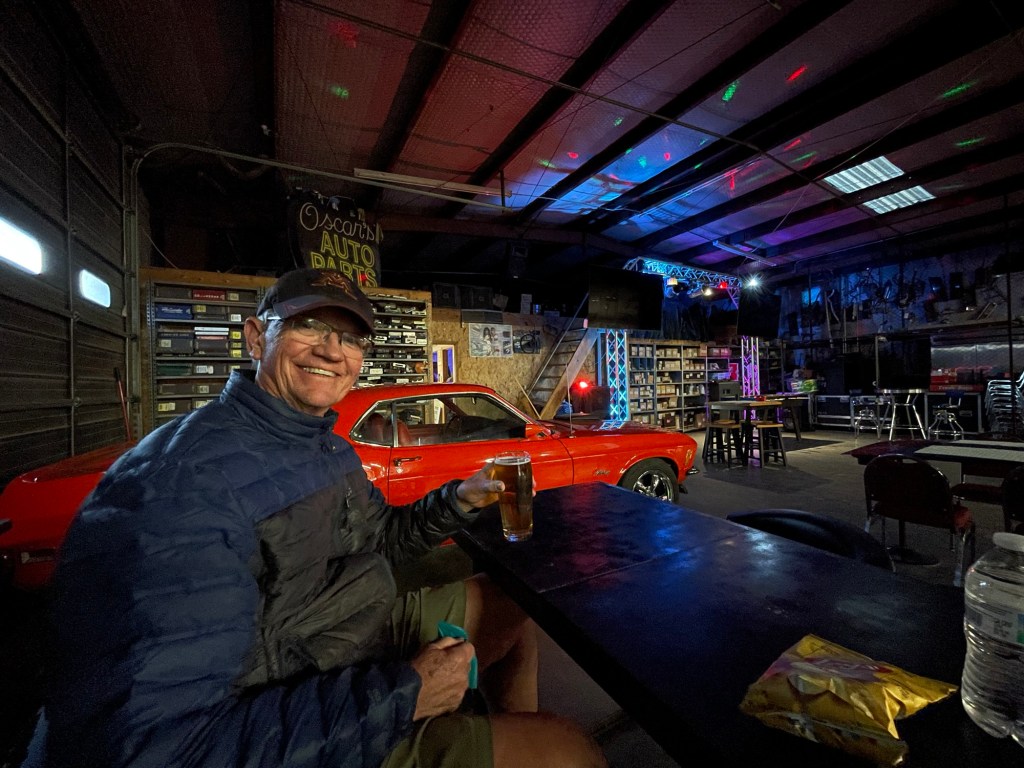 Because of the warmer than usual weather, unlike other years, we slept in the RV for two nights on the way home. We used the bedroom and bathroom without opening the slides or having any water, electricity or sewer services. The RV battery was enough to power the lights, and we dumped water from a jug into the toilet when flushing. The first night we stayed in the parking lot at Junkyard on 66 Brewery in Grants, New Mexico, after eating dinner there. The tables were made out of old car parts. We had mixed feelings about staying in this town after our truck broke down there on the way home last year. You can read about that adventure here.