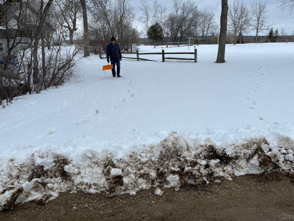 We drove the last stretch home on Sunday after the storm was over. There was about four or five inches of snow in our yard when we got home, but more importantly a big ridge of snow and dirt at the end of the driveway from the snowplow.
