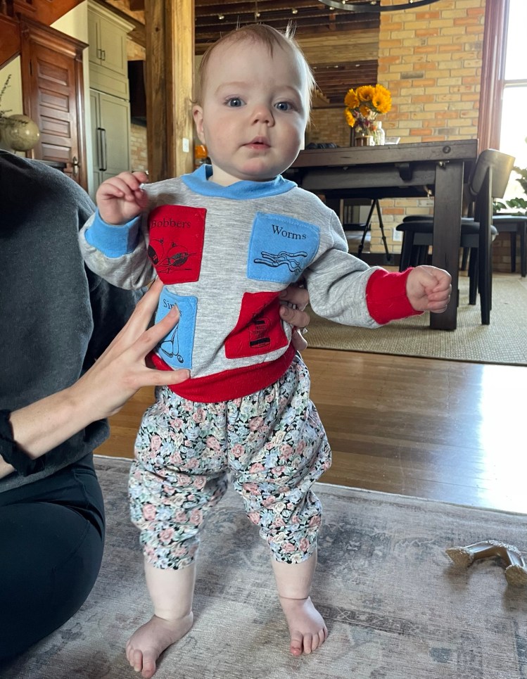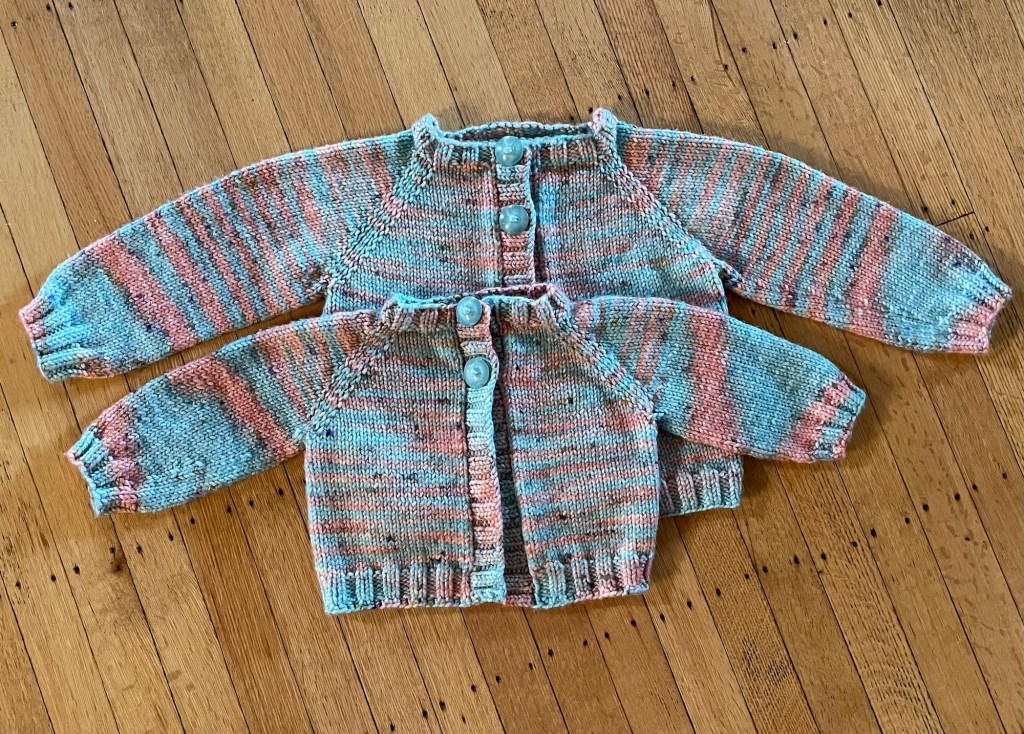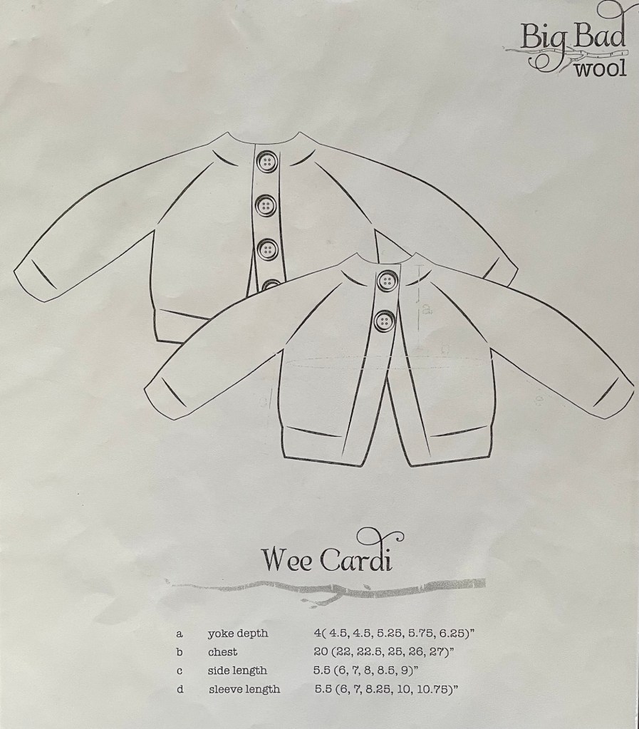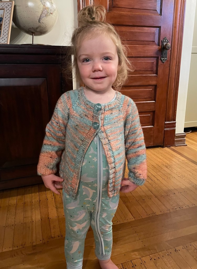On our next visit to the Twin Cities, I tried the sweater on Nora. It fit perfectly! I do not think the yarn is machine washable, and it could be a bit scratchy. It looks cute, but probably won’t get much actual use.