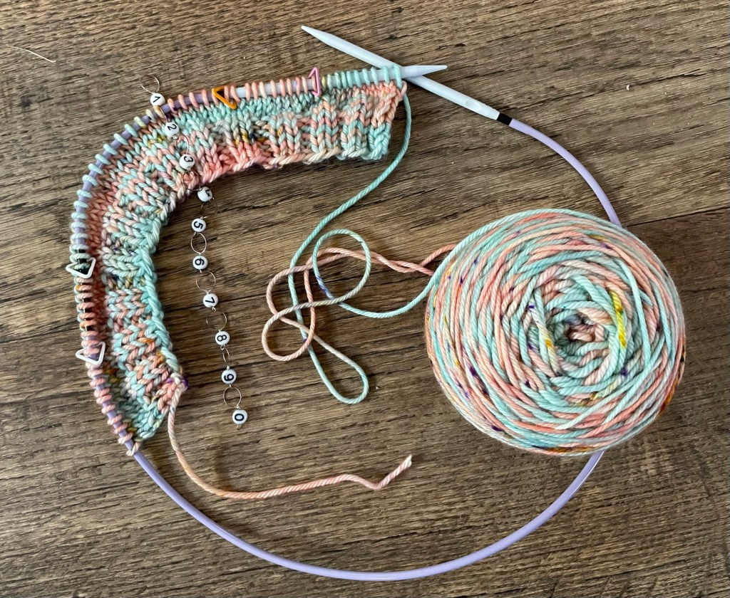 Undoing the shoulder kitchener stitches was not hard, but then the top of the sleeve was messed up. I kept looking at it trying to figure out how to get it be right. It turned out to be easy to rejoin about 3 shoulder stitches on the sleeve side, and then re knit the entire sleeve. The next photo shows the project with the shoulder stitches adjusted and ready to re-knit on the sleeve.