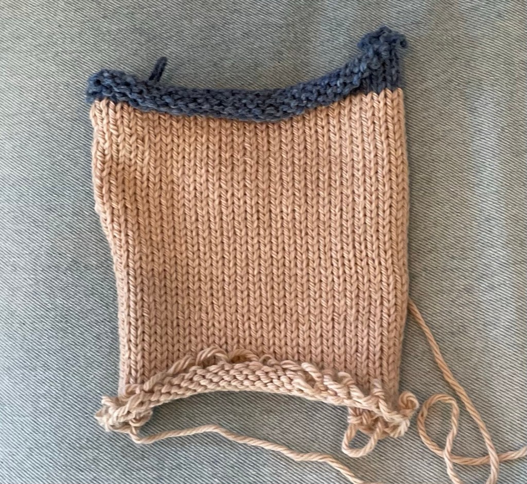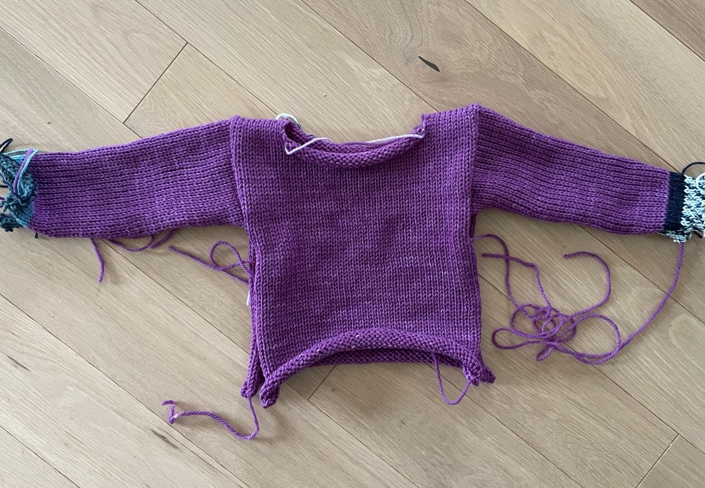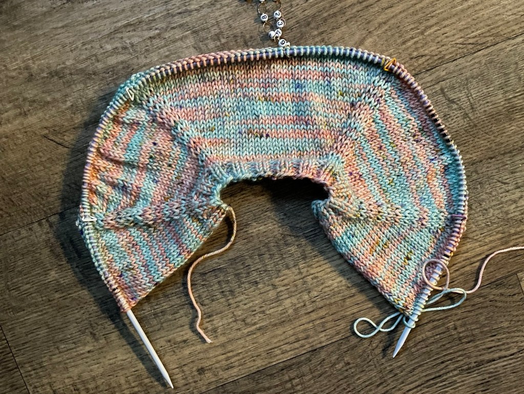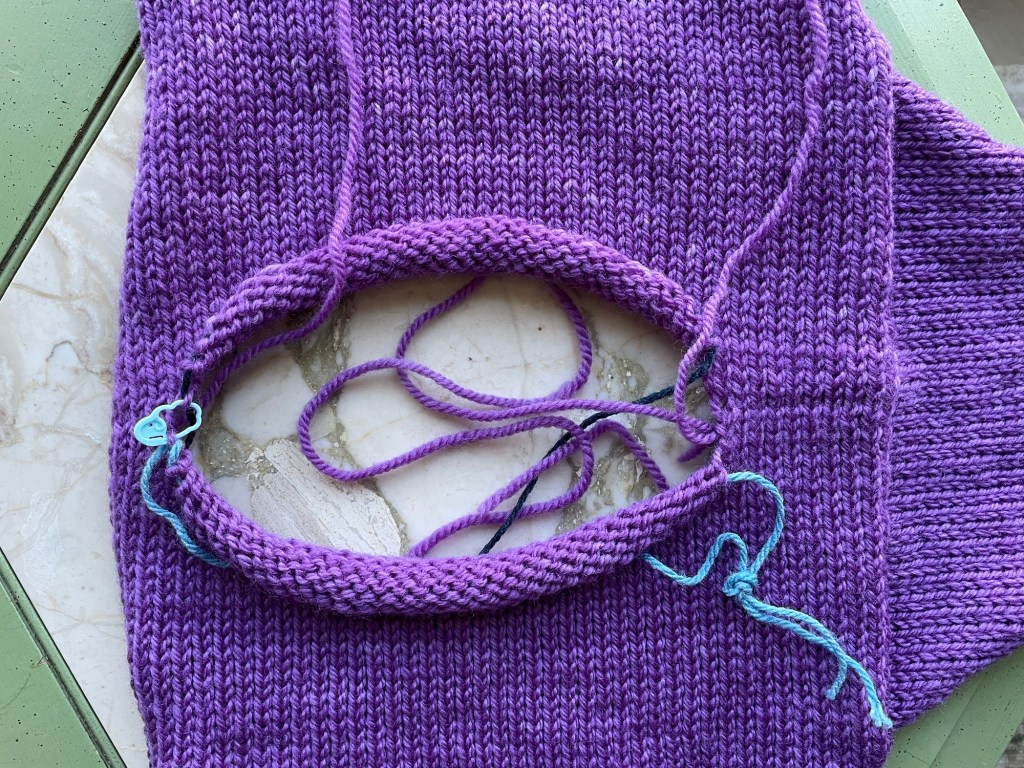 Notice there is a weird hole at the top of one sleeve seam at the shoulder. After getting to this point, I realized that the neck opening likely would not fit over my granddaughter’s head. A hat I knit her in about the same weight yarn had 72 stitches around. There are only about 50 stitches in the circumference of this neck, after adding two stitches at each side.