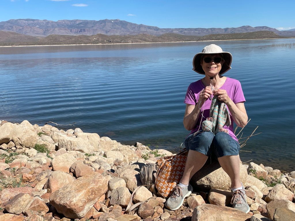 Sally and I got a ride into town with Harvey to look at some shops and get a few groceries, and where we met up with Wayne. Steve arrived back from Bozemen with the loaner car and met up with Sally. Other than that it was a welcome quiet day of hanging around the camp site. I typed up more trip notes and worked on my knitting project.
