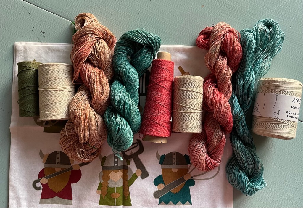 I thought it would be fun to weave a set of towels on the Structo Artcraft loom using colors coordinating with the Viking theme towel. They could be given as a fun gift set. At first I thought I might have to buy yarn for this project, but after digging through my weaving yarn I already had the right colors on hand.