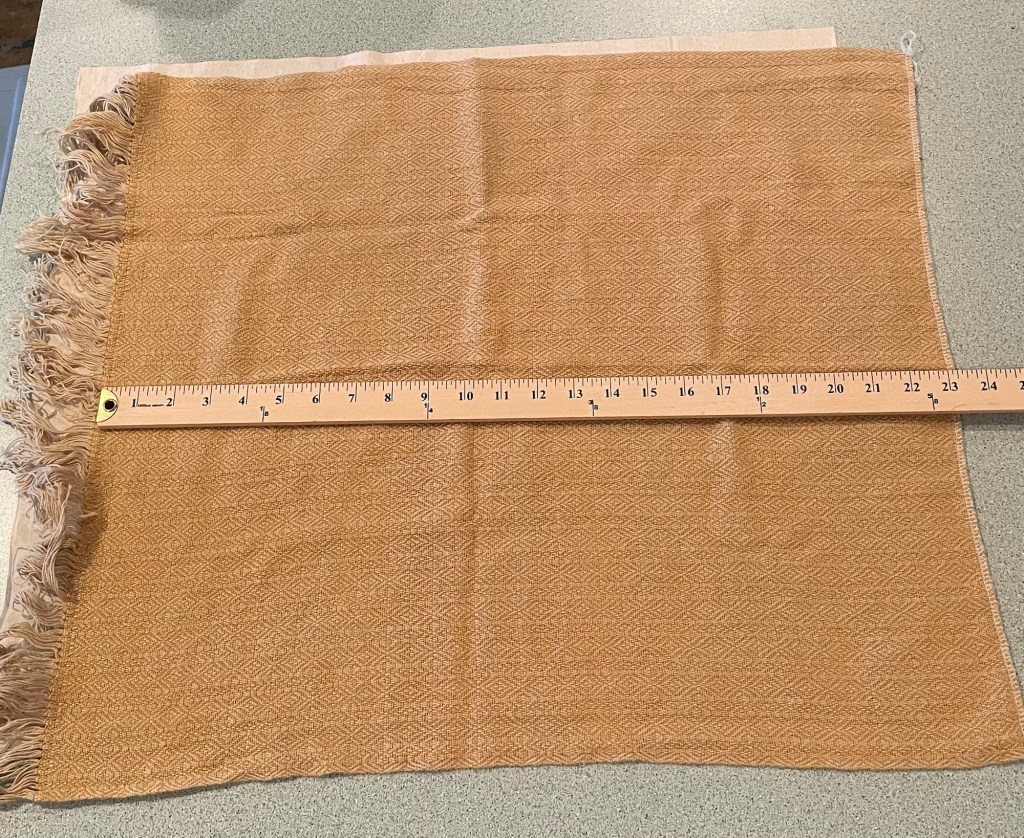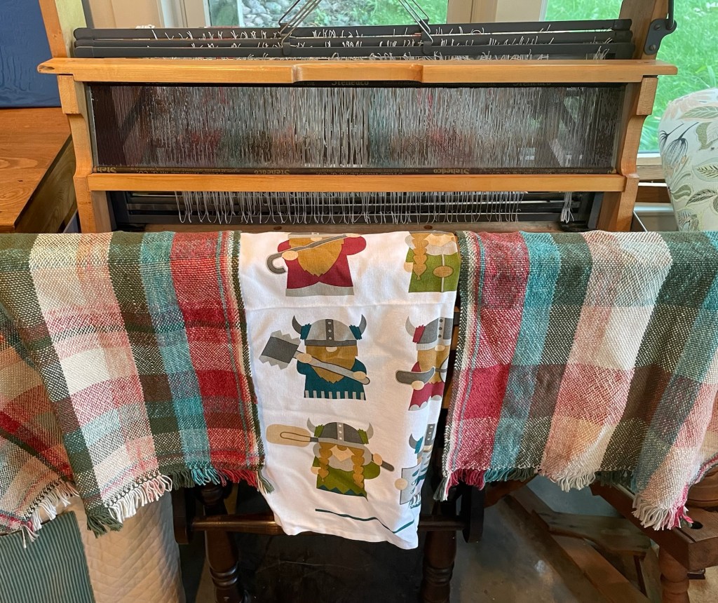 I wanted to finish this weaving project and publish a blog about it before we are out of town for two weeks. We are getting ready to leave for a trip to Yellowstone National Park and the Grand Tetons with our 5th Wheel Trailer. Some people warp enough yarn for 4 or 6 or more towels. Given I am always nervous about tension problems, I prefer to measure a shorter warp. In this case, I was glad I only had enough for two towels, and with the challenges I had, I am glad to be done.