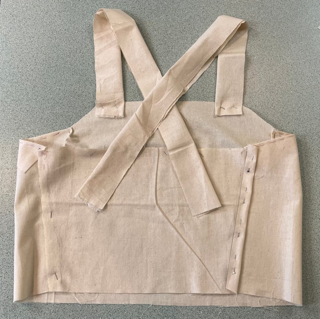 It seemed like the most effective type of back closure was corset style lacing. That would allow it to be as tight as desired, and also adjustable if I did not get the measurements perfectly. I found some YouTube videos showing how to make corset style lacing, which involved sewing loops on to a secure base. I also had to find something to use for the laces.