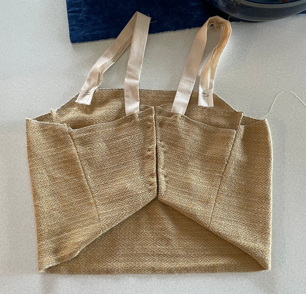 While all this was happening, I had been experimenting with band weaving on a narrow rigid heddle style loom. I wove a narrow band using the same cottolin yarn that I had used for the woven fabric. I was not sure exactly what I was going to use it for. It could be used for either the loops or the ties, if I did not find something better.
