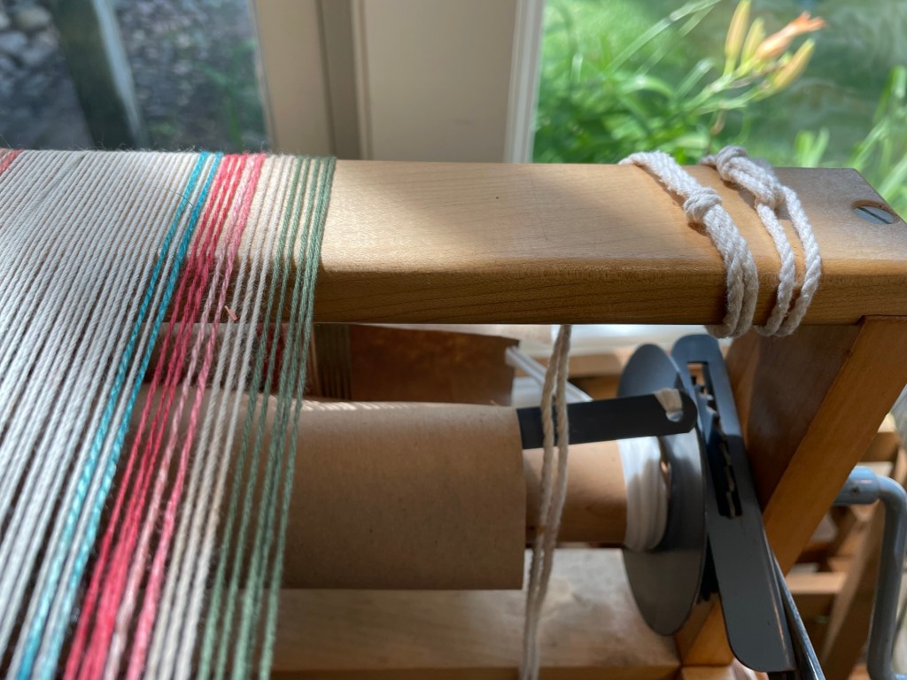 I wound on half of the warp yarn in one warp chain, then realized that there was not as much of the green cotton and red duet yarn as I thought there was. I changed the pattern of colors a bit for the second half.