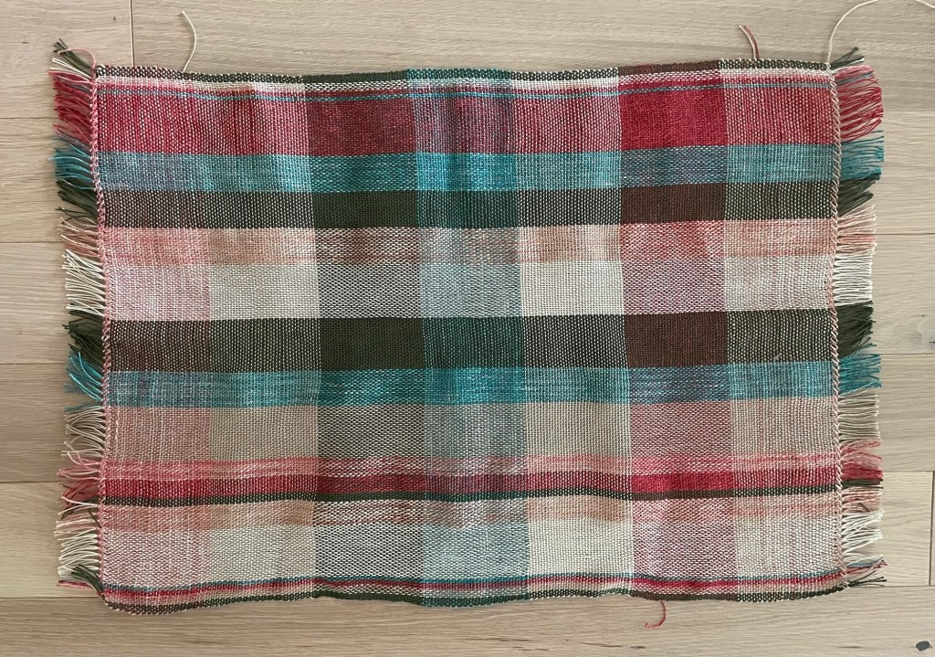 After looking at some ideas online, I decided to go for a plaid look in plain weave. No fancy pattern, just the pretty colors. The linen yarn was on the thicker side of the range for the 15 ends per inch reed that came with the loom. Figuring out the details involved making sure there was some 100% cotton yarn between the blocks of linen and cotton/linen blend yarn, not having too much linen yarn as a proportion of the total, and making sure the arrangement of colors looked pleasing.
