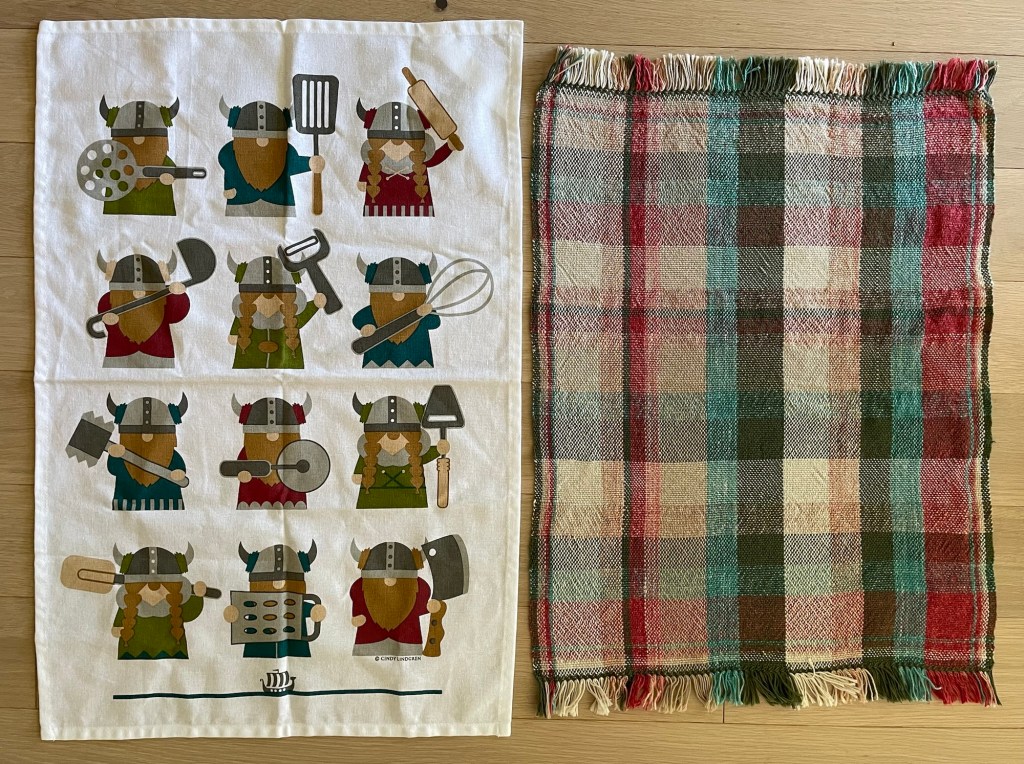 A dish towel I ordered from Cindy’s shop has art showing Norwegian Vikings holding kitchen utensils. The same art is available on other items.