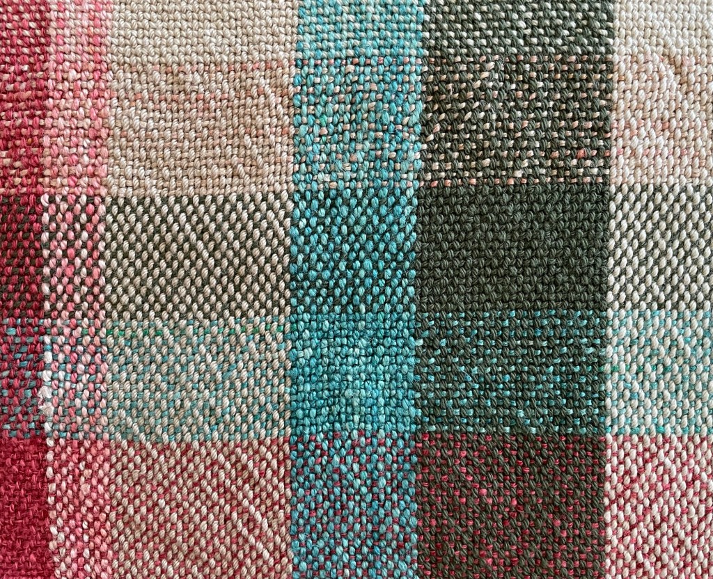 I knew that using different types of yarn in both the warp and weft would affect the look of the fabric and result in different take-up and shrinkage. The thicker linen yarn caused those sections to bow out a bit. The fabric seemed very stiff. I had been worried that using the 15 ends per inch reed would make the fabric too dense, but visually it seemed right.