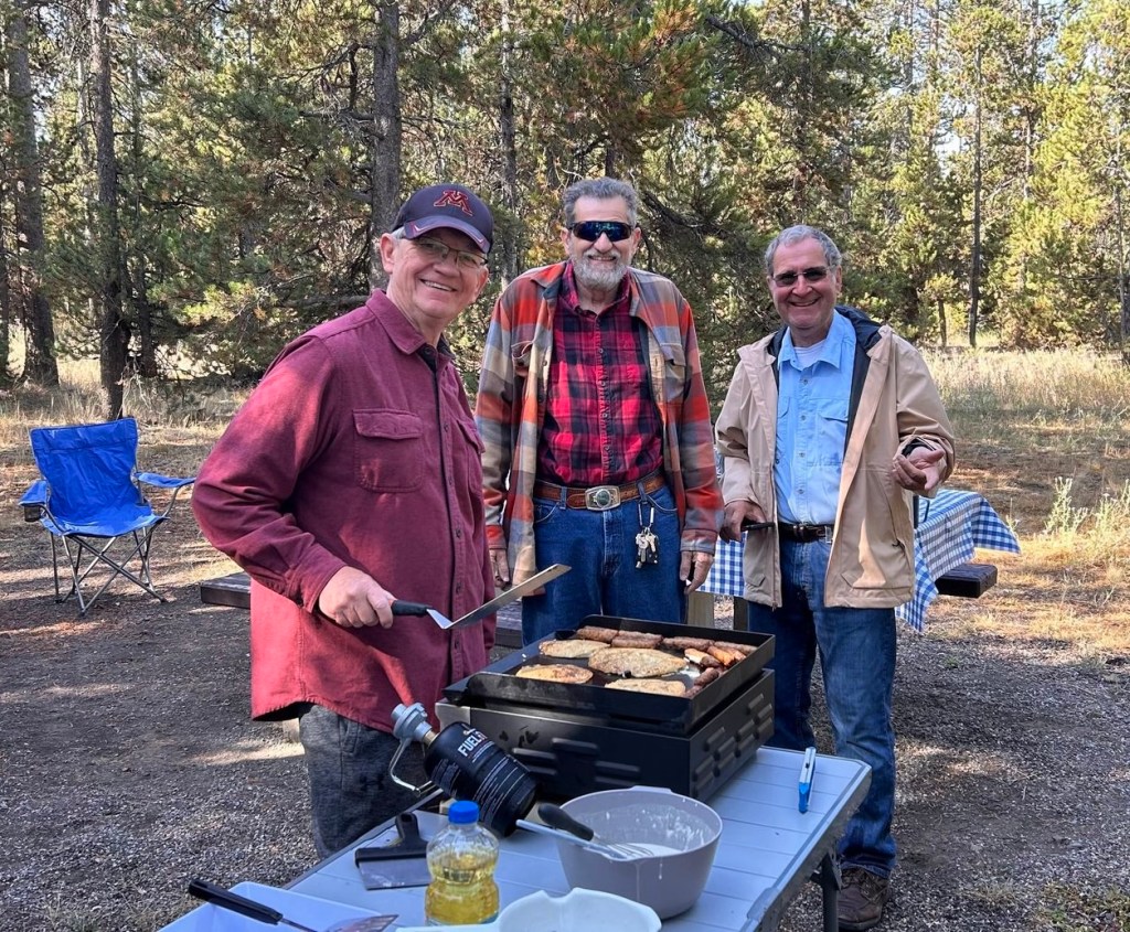 Wayne planned breakfast at our campsite for the entire group of eight people, including eggs, sausages, and pancakes with our family made maple syrup. He forgot that we have a small stove and one frying pan in the RV. I started to think about how we could cook the sausages first and put them in the small oven to keep warm, then cook the eggs and put them in the oven, and lastly cook the pancakes. Then I remembered that Steve and Sally have a big outdoor griddle. They were very willing to move that over to our campsite. Wayne cooked the sausages and pancakes outside on the griddle, while I cooked eggs inside the RV on the stove. It worked well and everyone enjoyed the meal.