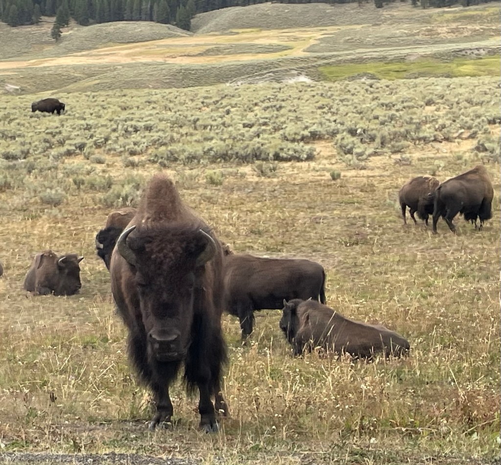 Next we drove through the Hayden Valley, an area where it is common to see animals. We saw many bison, including a few mother bison nursing babies. Some of the bison were making grunting noises, which we later found out happens during mating season.