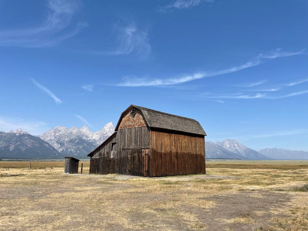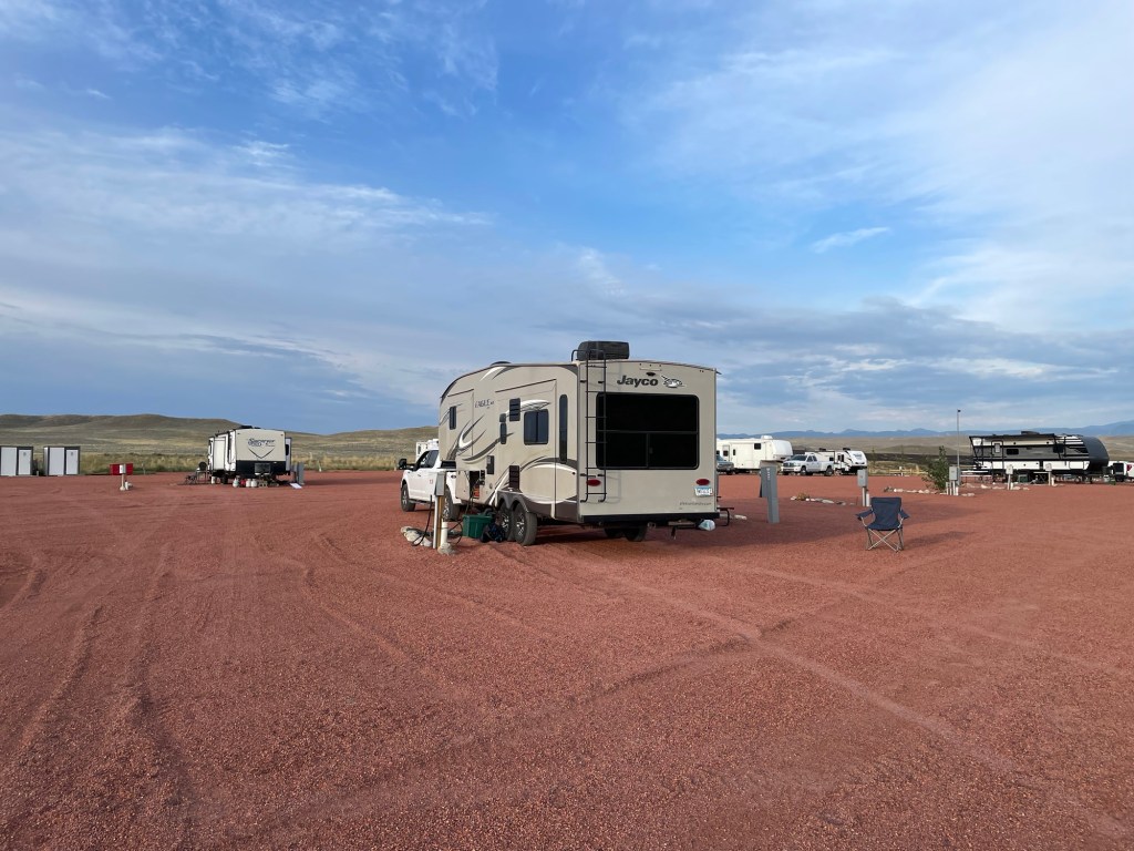 It took all morning to prepare for leaving Baker’s Hole campground and towing the RV to another campground near Grand Teton National Park. This was different than packing up the RV after a winter in Arizona. I left food in the refrigerater, and most of the dishes and food in the cupboards, moving only heavy or loose items into boxes on the floor. Baker’s Hole campground does not have a dump station, but we were able to empty out the black and gray tanks at Yellowstone Grizzly RV Park in West Yellowstone.