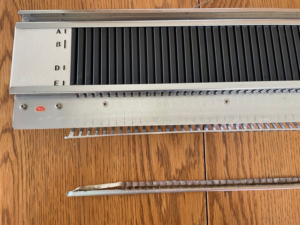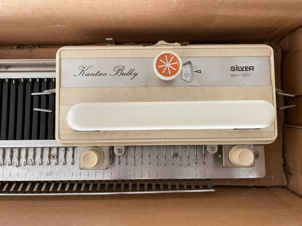 I was excited to open the boxes, to find out what I now owned. The smaller box contained a vintage metal Silver SK-120 Kantan Bulky flatbed knitting machine. The machine was a little dusty but it appeared that all the parts were there. I was able to find a user manual online.