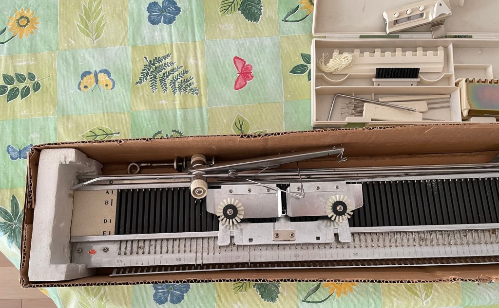 The second very large box contained a double bed White Technique Brevets Mondiaux, made in France, also metal. I found out later it was manufactured under several names, and is also known as a “Supurba”. The “double” means that it can do ribbing and more complicated patterns. It has more needles closer together for thin yarn. It looks very intimidating. This also seemed to have all the parts, including the user manual and some cassette tapes. Hmm, I do not think we have a cassette tape player.