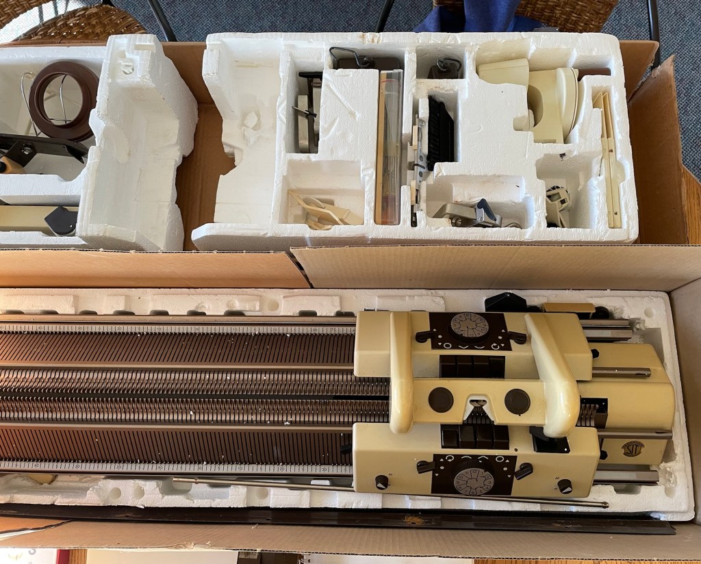 My husband was not excited about more things coming into the house. I assured him that if I decided not to keep either of the knitting machines, I would pass them on to someone else. I was able to move the smaller box into the house by myself and put it on the dining room table, but needed Wayne’s help to carry the larger one inside to another table in our three season porch.