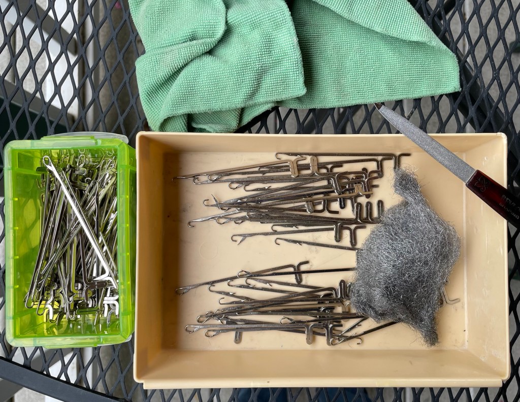 After we had gotten the house back in order, my texsolv heddles arrived in the mail. They seemed to be too short, even though had I measured very carefully. It is hard to tell from this photo of the original metal heddles next to the new texsolv heddles.