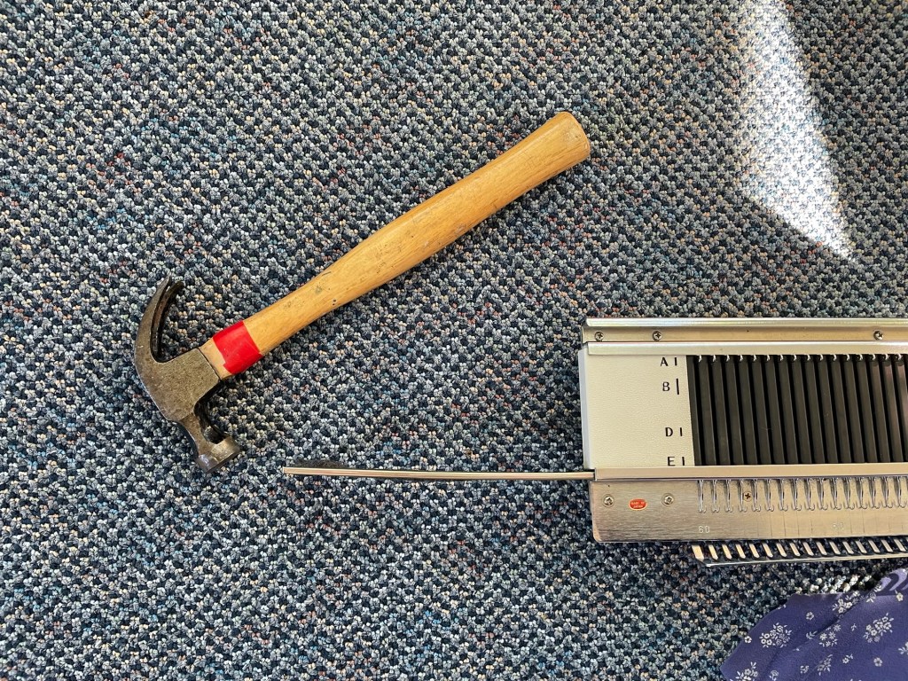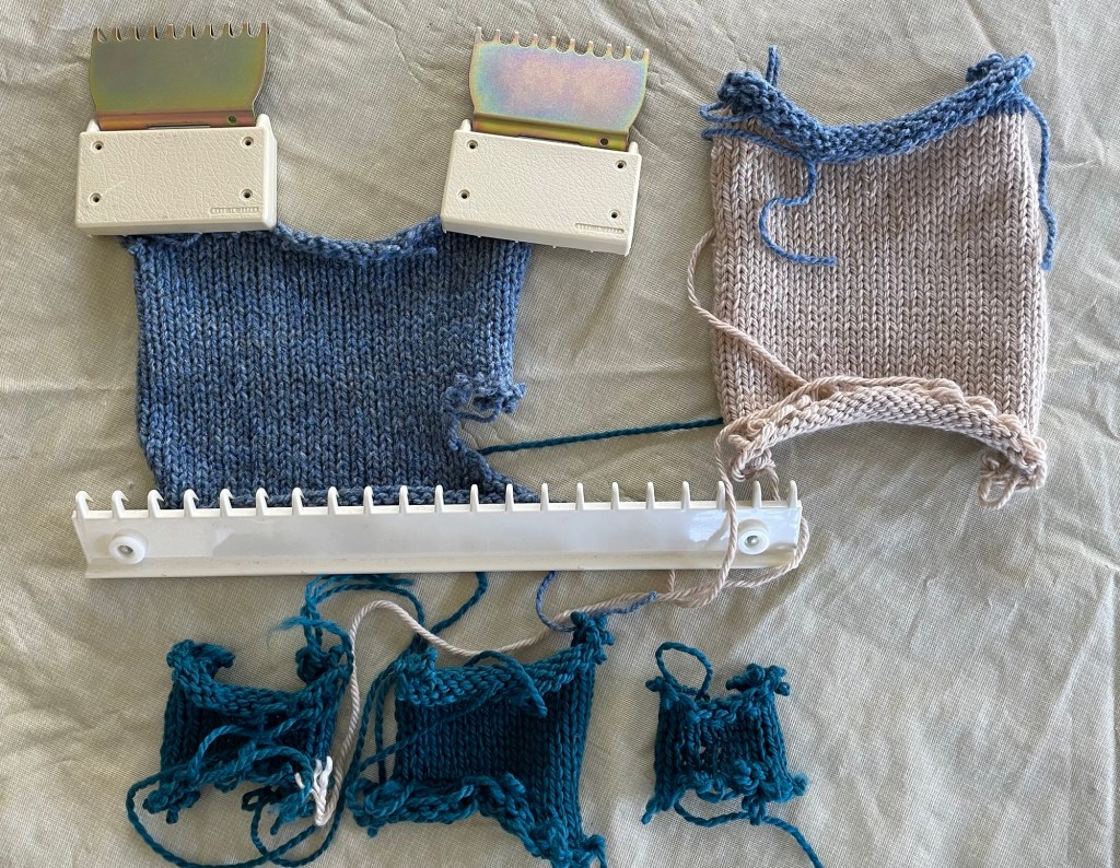 I have been enjoying membership in the School of Sweet Georgia, and their online community of “multi craftual makers” who, like the founder Felicia Lo, like to “make all the things”. A recent class offering is Machine Knitting 101, using a basic flatbed knitting machine. I had never been interested in flatbed machine knitting before, but I watched the beginning of the class. The instructor, Barb Barone of Yarniversity by River City Yarns is the Bob Ross of knitting instructors, with a very calm and gentle approach. Suddenly machine knitting became intriguing. One of the reasons people like flat machine knitting is that it takes so darn long to knit a sweater or anything larger than a hat or scarf. I liked the idea of combining hand knitting with machine knitting the tedious parts of a sweater.