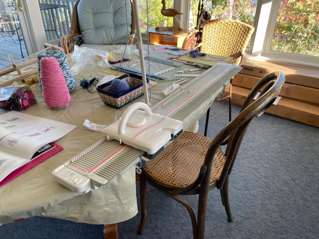 After we got back from our August RV trip out west and I had gotten settled back at home, I went to Torri’s shop to exchange equipment. The loom took up the entire trunk of our Honda CRV with the back seats down. Torri moved things around to make a space for the loom and dug out the knitting machine boxes. They were both four feet long, bigger and heavier than I expected.