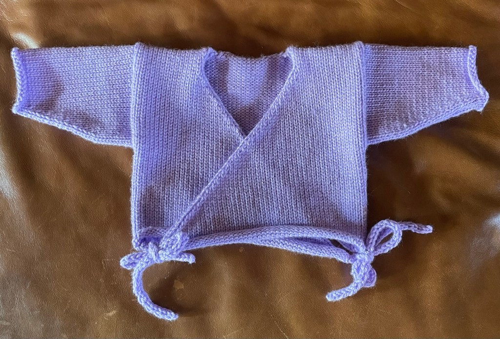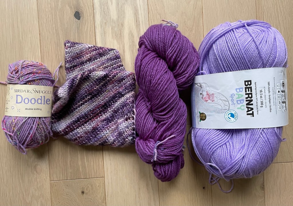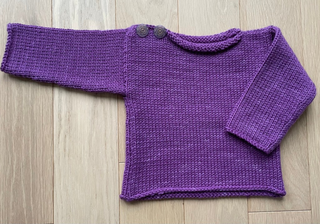 The purple 100% wool yarn I dyed at fall Fiber Day is the perfect type of yarn for making something on my newish LK-150 flatbed knitting machine. I aspire to make a sweater for myself, but there is not enough purple yarn for that. The yarn is not ideal for a baby sweater, but making another small sweater was good for practicing on the machine.