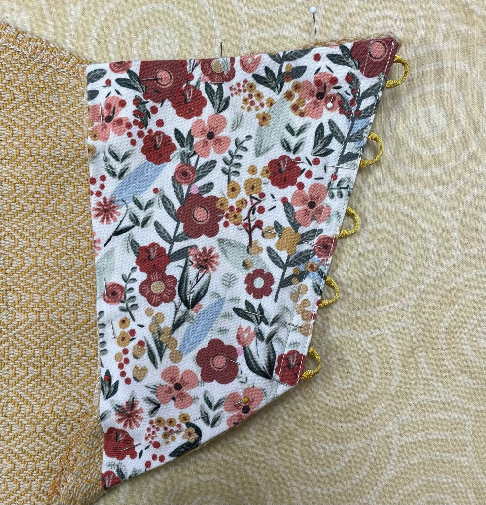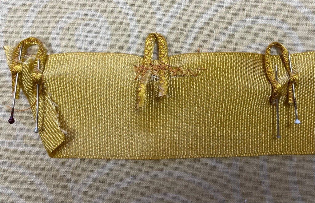 I was just winging it at this point trying different things to make the corset back. The videos suggested sewing loops using bias cut strips of satin fabric. I did not want to do that. Instead I made loops by folding 1/4″ yellow ribbon in half and zig zagging it. I thought it would work to sew the loops on to wide grosgrain ribbon, and then sew that on to the lining fabric. The loops wanted to wiggle all over, and when I finally got one loop attached, the ribbon started to rip. That was not going to work.